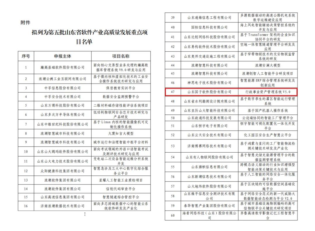 近日,为积极响应《山东省人民政府办公厅关于加快推动软件产业高质量发展的实施意见》(鲁政办发〔2020〕1号),提升高端软件供给能力与创新链效能,赋能传统产业升级并催生新模式,山东省工业和信息化厅开展了第五批山东省软件产业高质量发展重点项目申报工作。经过企业申报、各市审核推荐、专家评审等严格流程,国子软件申报的“行政事业资产管理软件V5.0云原生改造升级”项目,凭借技术创新性与产业示范性,顺利通过公示期,成功入选全省重点扶持项目。这一认定标志着国子软件在资产管理领域的创新成果获得省级权威认可。